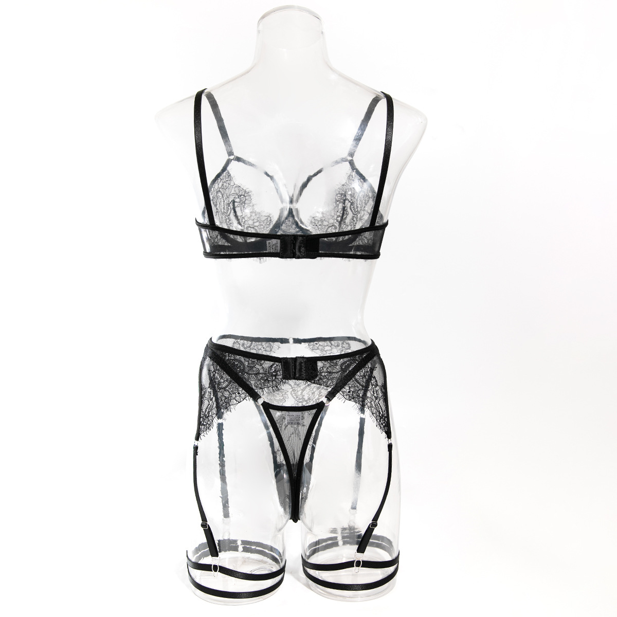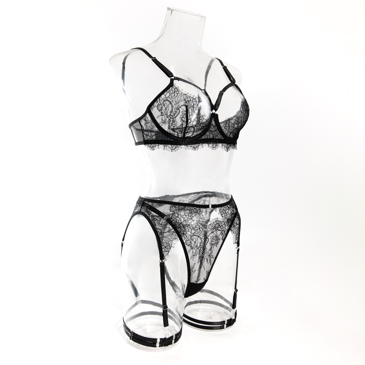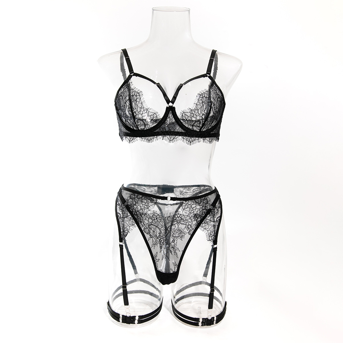Cross-border Sexy Lingerie Temptation Set Seductive French Eyelash Lace Hollow-out Bra Garter Belt Four-piece Set