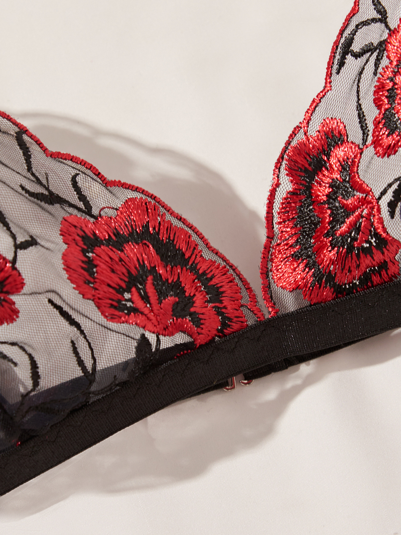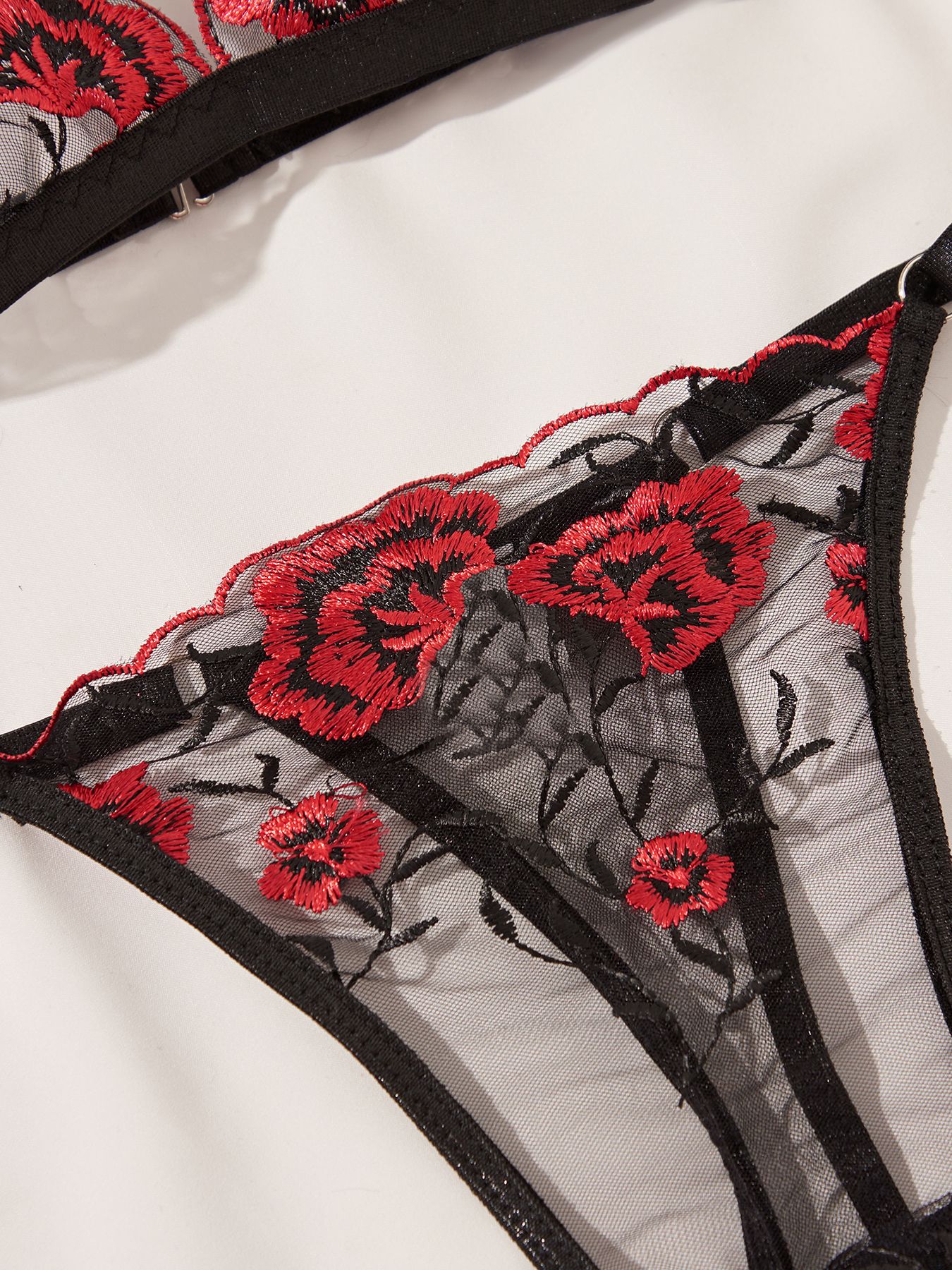 Embroidered sexy floral lingerie uniform perspective three-point erotic suit for women