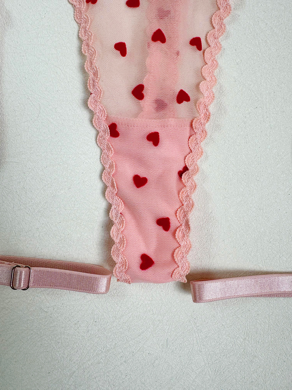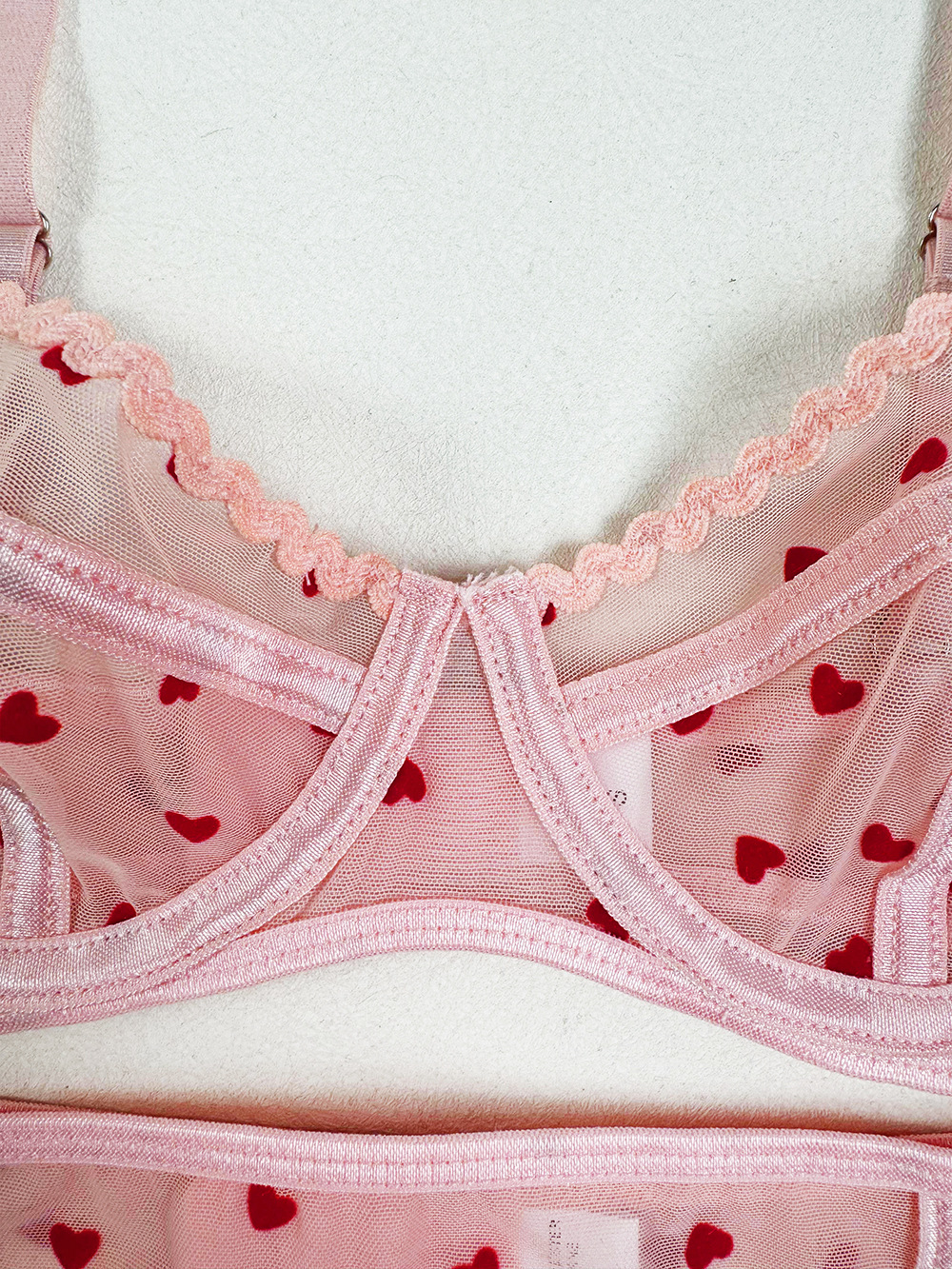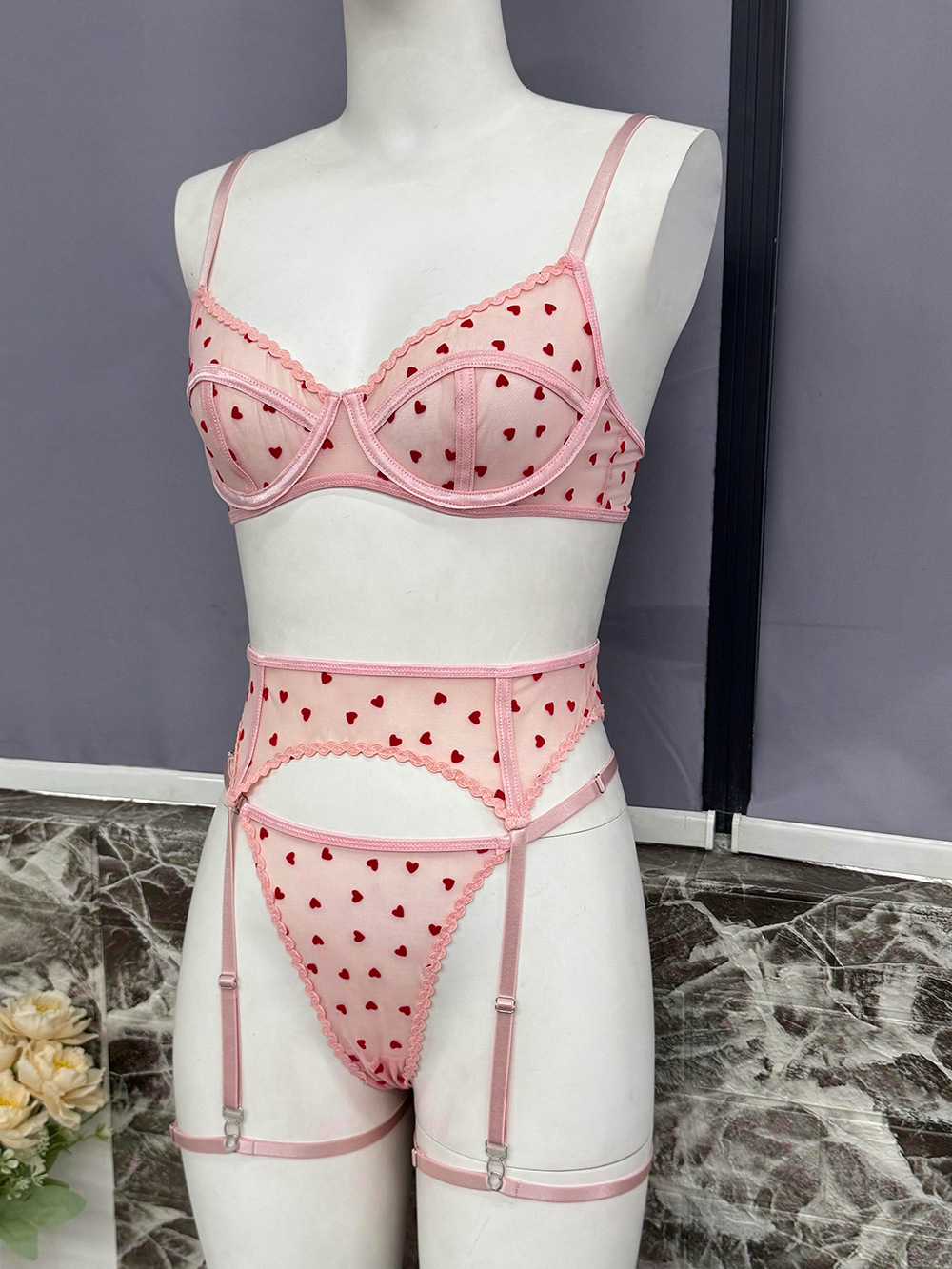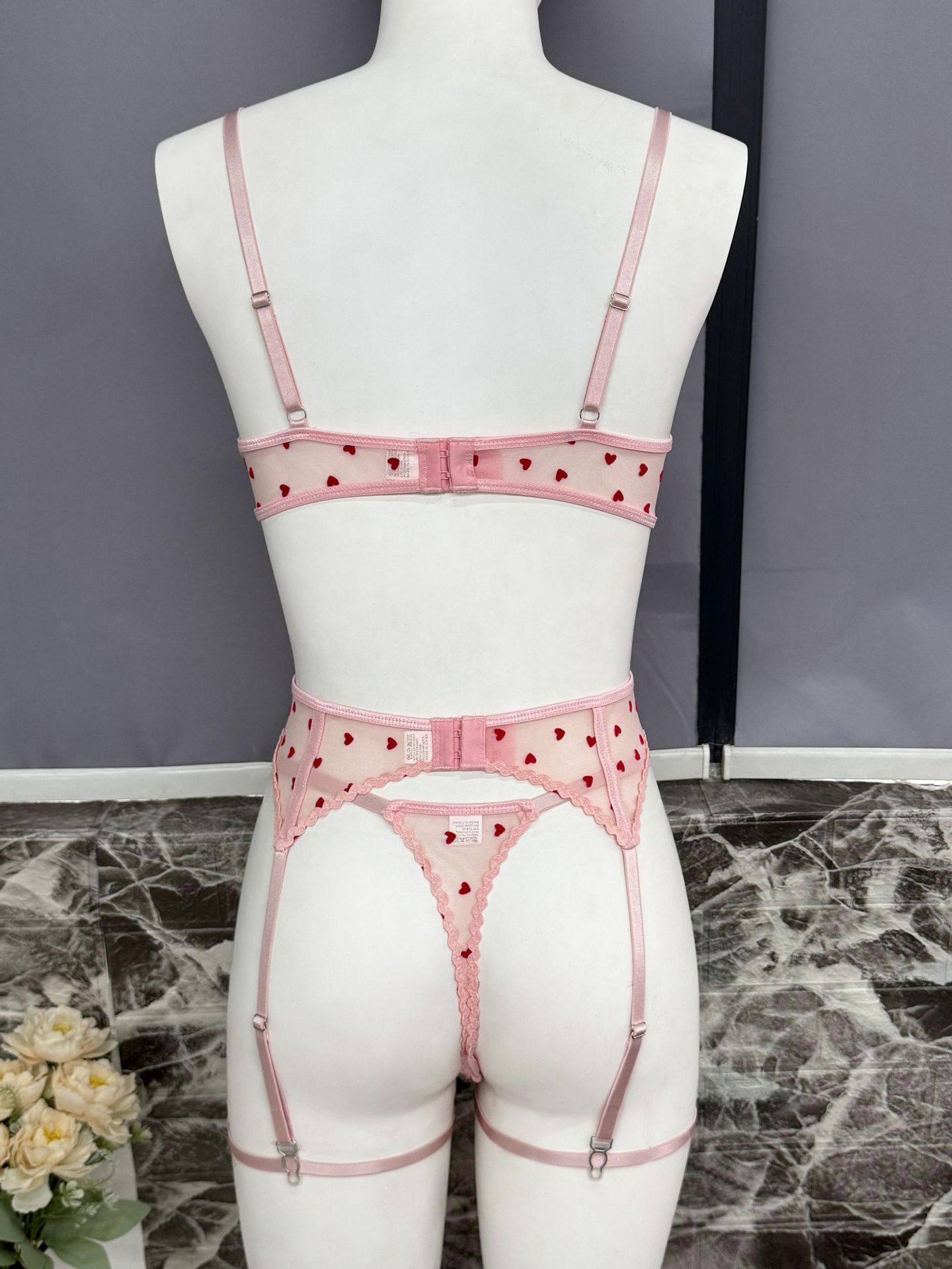 Flocked Heart 3-Piece Sexy Women's Lingerie Garter Belt Cute Girl Set