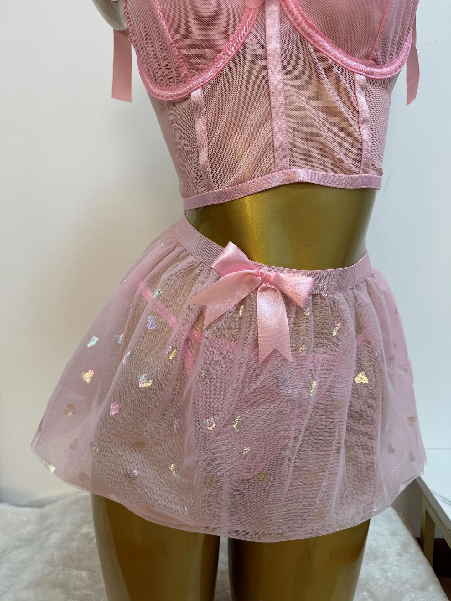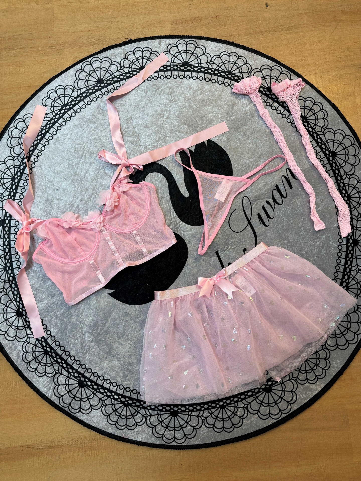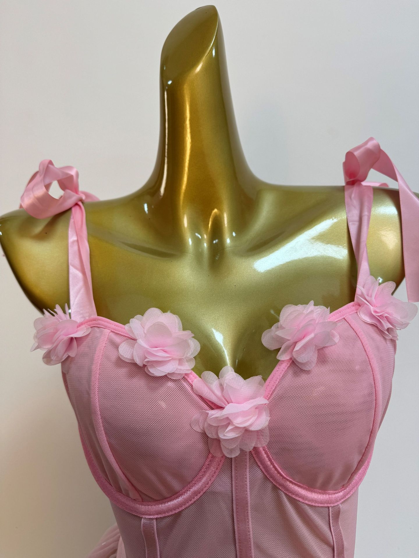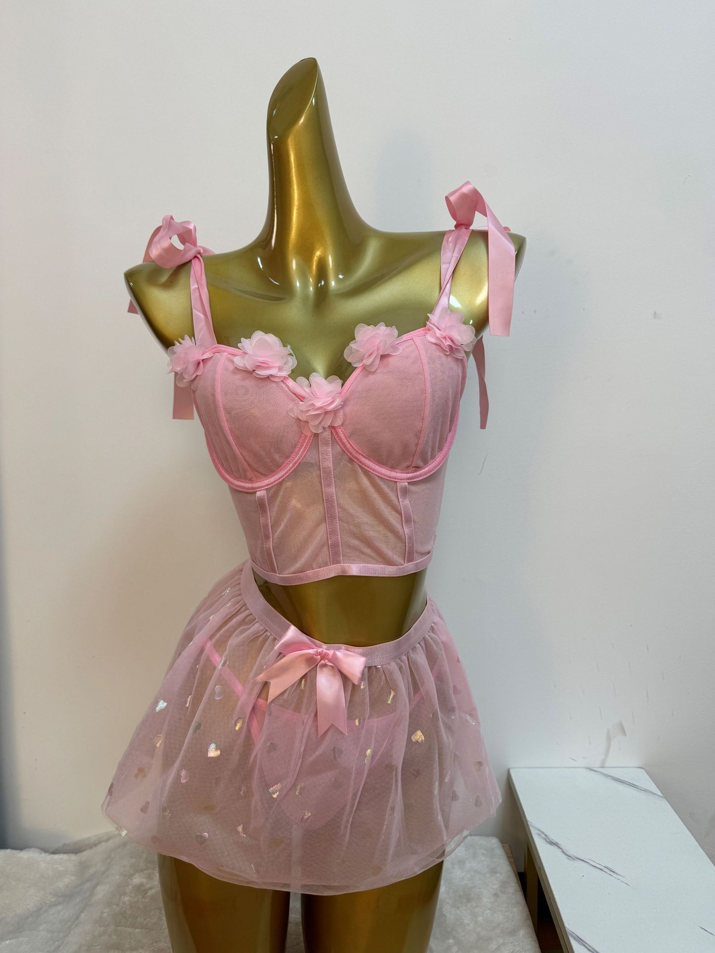 Sexy 3D Flower Bow Tie Sequin Mesh Skirt Lingerie Set