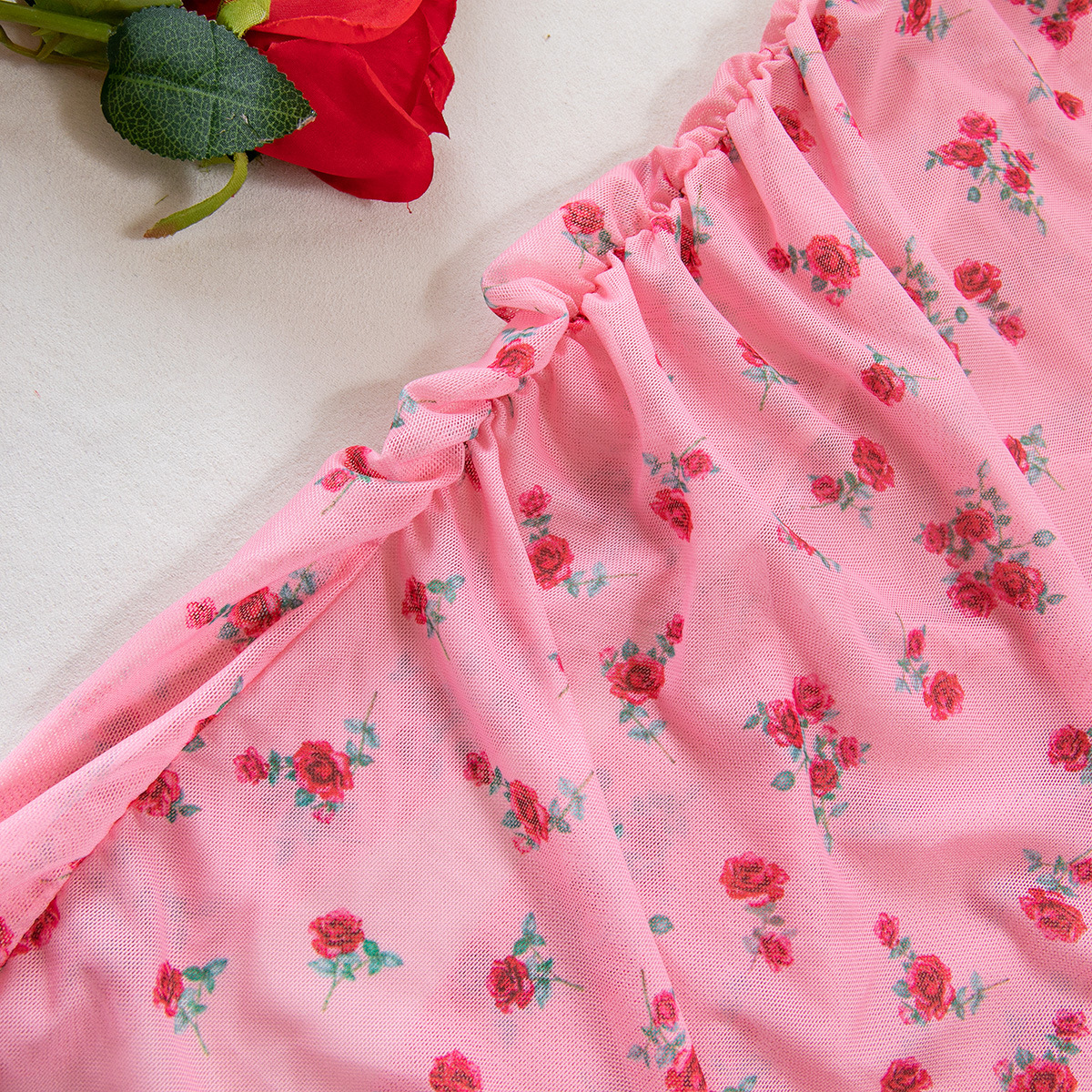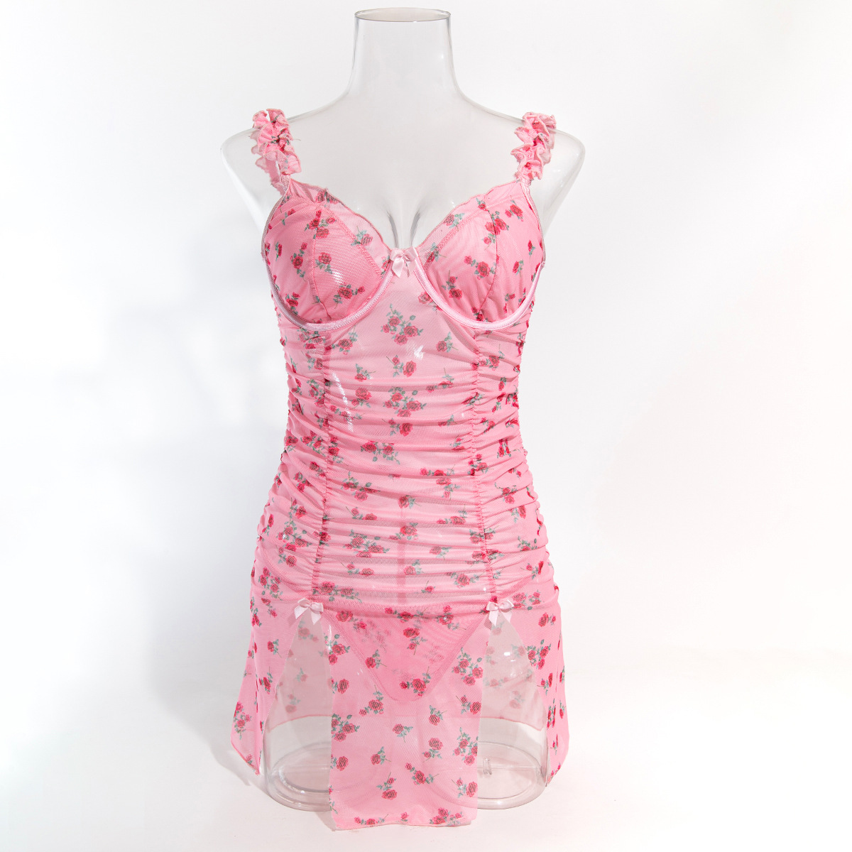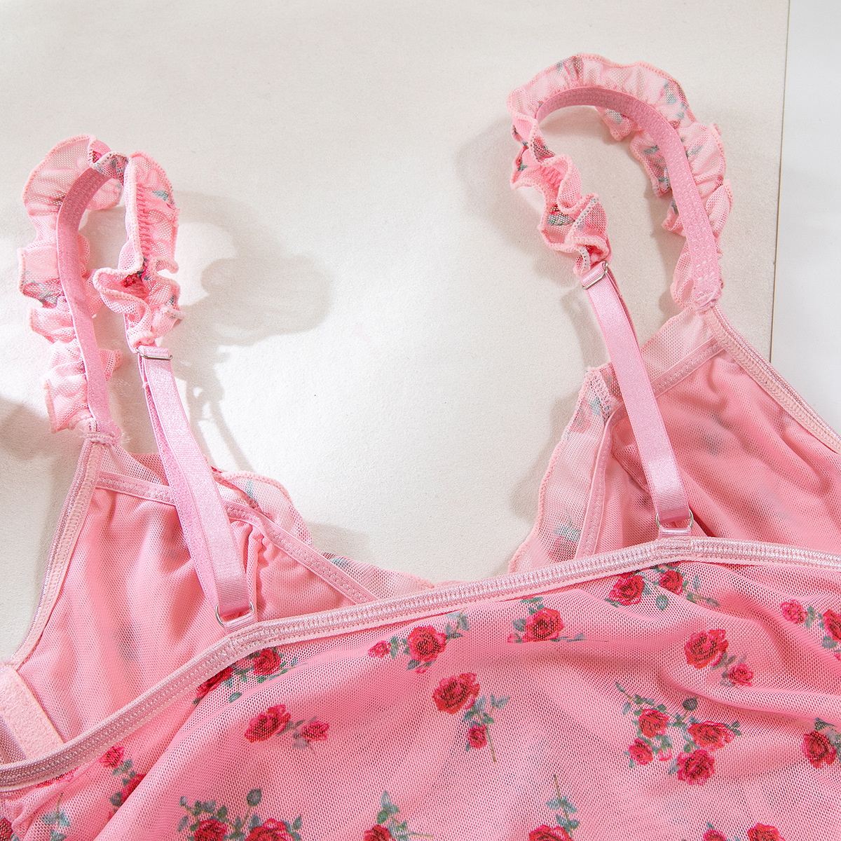 Sexy Lingerie Pink Printed Valentine's Day Strap Nightgown Uniform Temptation Thong Set