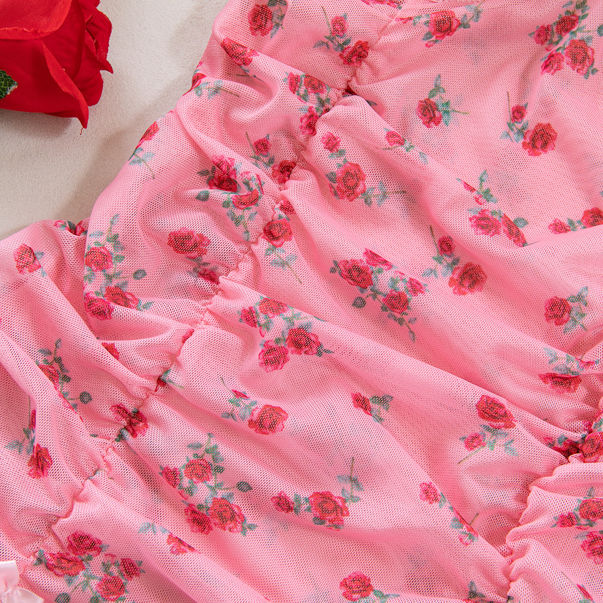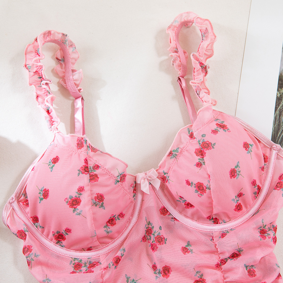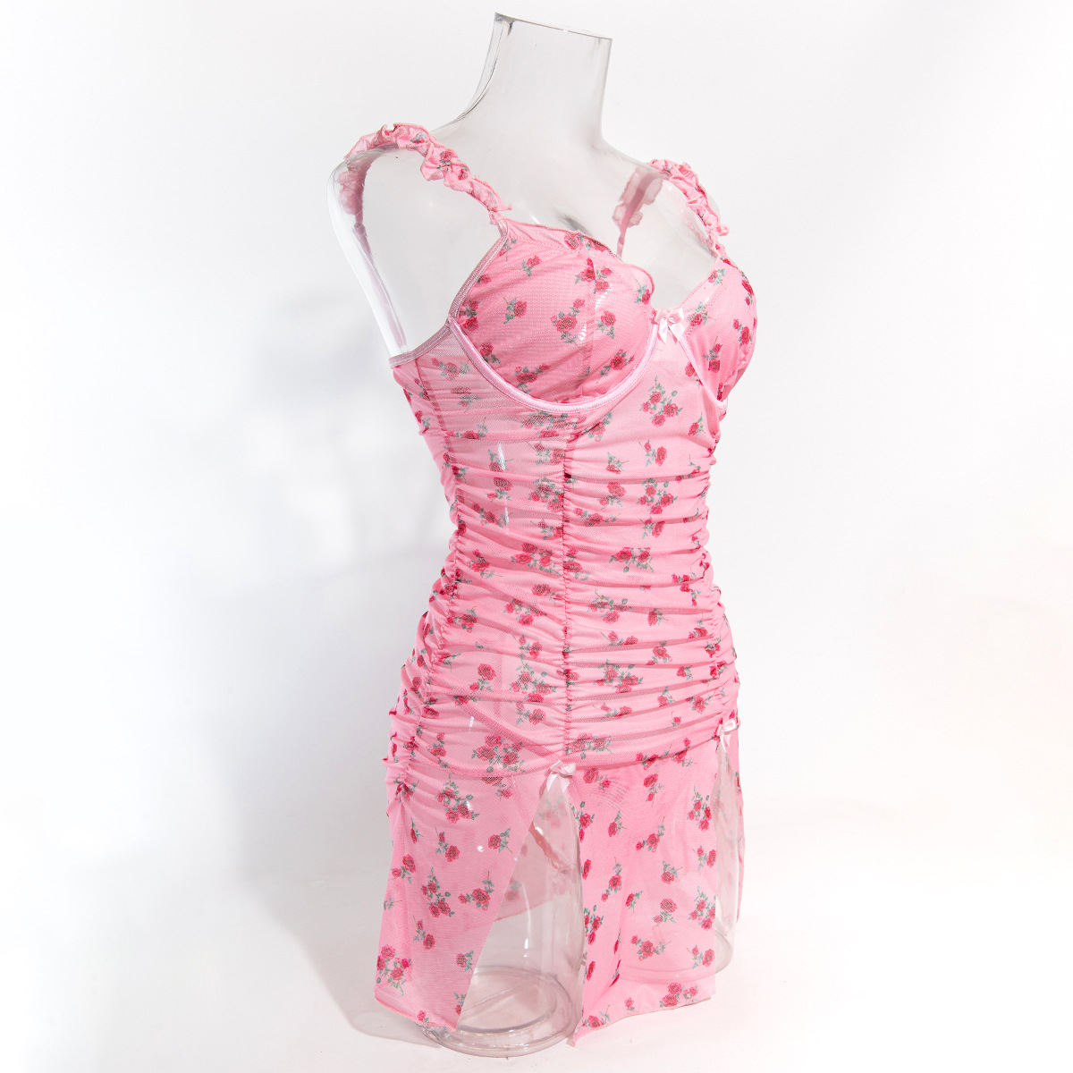 Sexy Lingerie Pink Printed Valentine's Day Strap Nightgown Uniform Temptation Thong Set