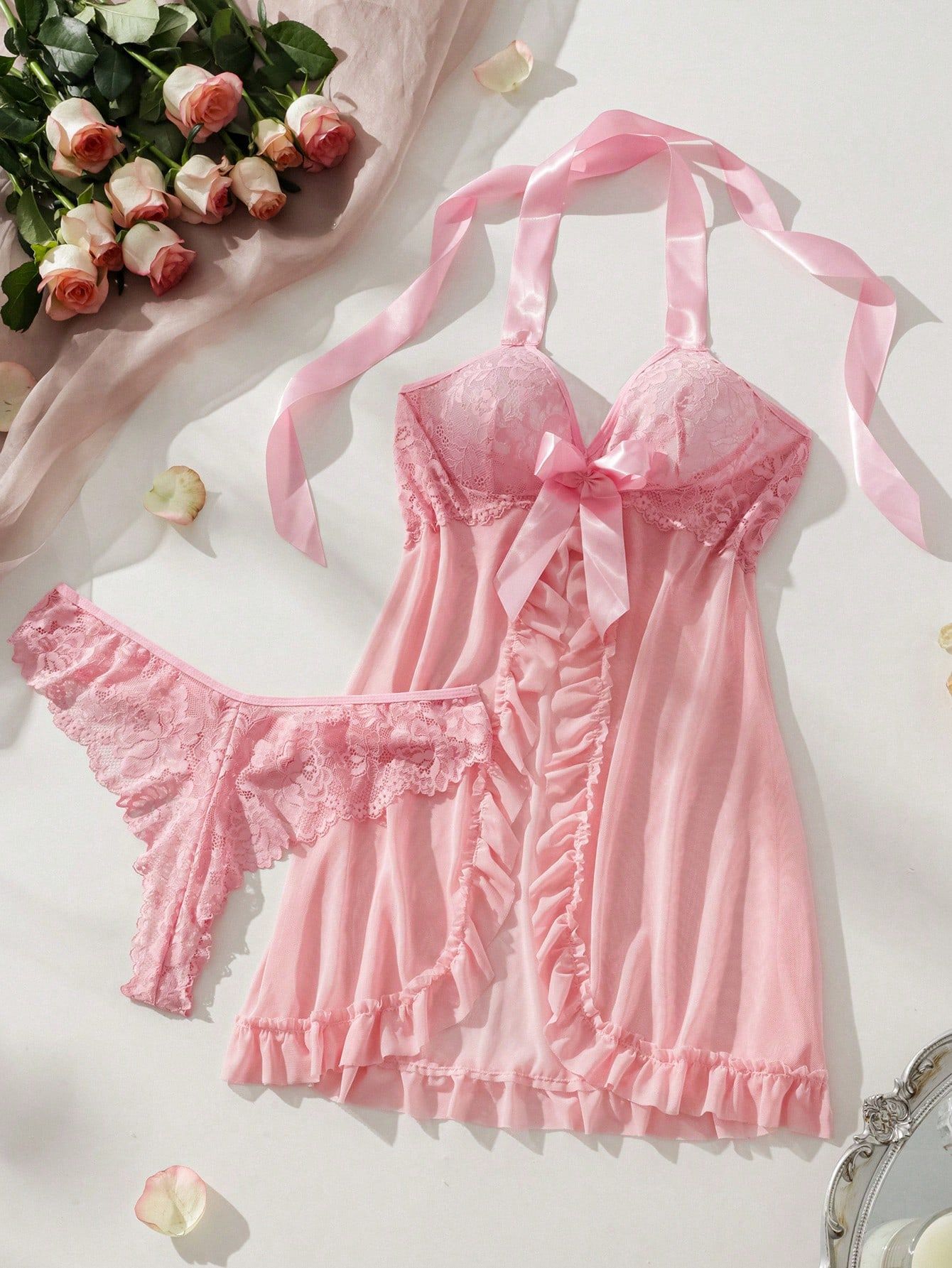 Sexy Lingerie Style Halter Women's Multi-color Mesh Sexy Nightgown Transparent Plus Size Low Chest Sleepwear